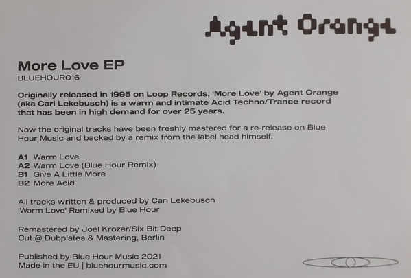 Originally released in 1995 on Loop Records, ‘More Love’ by Agent Orange aka Cari Lekebusch is a warm and intimate Acid Techno/Trance record that has been in high demand for over 25 years. Now the original tracks have been remastered backed by a remix from label head Blue Hour and previously unreleased bonus tracks.