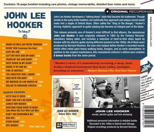 This Soul Jam release presents one of Hooker’s most difficult to find albums on CD, the eponymous John Lee Hooker. It was originally released in 1962 by the Fantasy Records’ subsidiary Galaxy label. The album includes a selection of hard-to-find recordings taped with his electric guitar during different sessions in the 1950s, all of them produced by Bernard Besman, the man who helped define Hooker’s recorded sound, which has often relied upon heavy walking beats, boogies, and an eerie atmosphere.