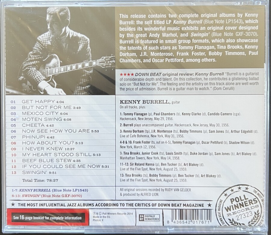 Two complete original albums by Kenny Burrell: the self titled LP Kenny Burrell (Blue Note LP1543), which besides its wonderful music exhibits an original cover designed by the great Andy Warhol, and Swingin’ (Blue Note GXF-3070). Burrell is featured in small group formats, which also showcase the talents of such stars as Tommy Flanagan, Tina Brooks, Kenny Dorham, J.R. Monterose, Frank Foster, Bobby Timmons, Paul Chambers, and Oscar Pettiford, among others.
