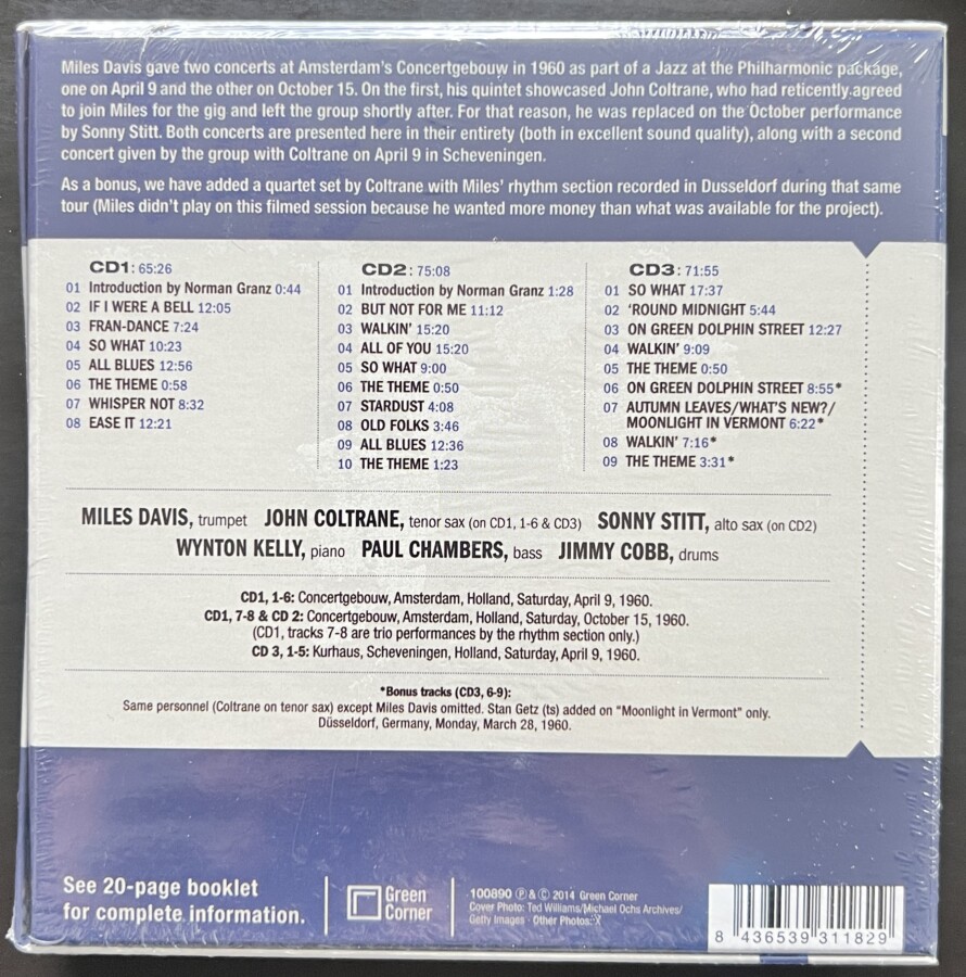 Miles Davis gave two concerts at Amsterdam’s Concertgebouw in 1960 as part of a Jazz at the Philharmonic package, one on April 9 and the other on October 15. On the first, his quintet showcased John Coltrane, who had reticently agreed to join Miles for the gig and left the group shortly after. For that reason, he was replaced on the October performance by Sonny Stitt. Both concert are presented here in their entirety (both in excellent sound quality), along with a second concert given by the group with Coltrane on April 9 in Scheveningen