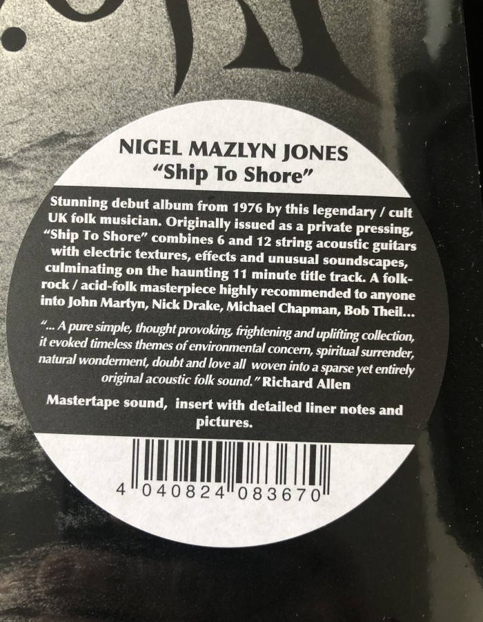 Álbum debut editado 1976 de forma privada por este músico folk británico de culto. Una maravilla oculta acid–folk / folk–rock altamente recomendada para fans de John Martyn, Nick Drake, Michael Chapman, Bob Theil, Pink Floyd… «Ship To Shore» combina guitarras acústicas de 6 y 12 cuerdas con texturas eléctricas, efectos y soundscapes. Escucha el tema que da título al disco, una maravilla de folk progresivo de 11 minutos con guitarras tratadas con ecos y efectos y alucina! Sonido de los másters, arte original, insert con fotos y notas por Richard Allen (Freak Emporium).